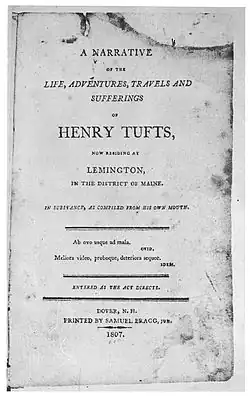 Most of what is known about his life and crimes comes from his 1807 autobiography A Narrative of the Life, Adventures, Travels and Sufferings of Henry Tufts, Now Residing at Lemington, in the District of Maine. In Substance as Compiled from his own Mouth.[1] The autobiography was reprinted in 1930 as Autobiography of a Criminal.[1] Neal Keating's 1993 reprint of Tufts' autobiography summarizes Tufts as a "horse thief, bigamist, burglar, adulterer, con man, scoundrel, counterfeiter, (military) deserter and common criminal", while also casting doubt on the veracity of his account.