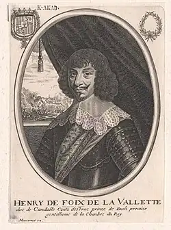 Henry (Henri) de Nogaret de La Valette (died 1639) was the eldest son of Jean Louis de Nogaret de La Valette (1554–1642), first Duke of Épernon and Admiral of France, and his wife Marguerite de Foix (1567–1593), comtesse de Candale. From his mother Henri inherited the title of Comte de Candale, becoming the 7th of that line, and was generally known by such title.