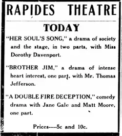 - Thomas Jefferson and Lina Basquette starring the one-reel drama Brother Jim.[39]