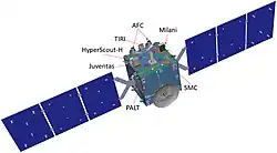 The main bus of Hera has a box-shape based on a central tube and adapter cone of 1.6 × 1.6 × 1.7 meters. Two solar panel wings extend from opposite sides, and a high-gain dish antenna is mounted on one face. Total launch mass of the spacecraft is approximately 1214 kg, the dry mass is 696 kg. Spacecraft deployed dimensions are 2.2 x 11.4 x 2.2 meters. The solar panels have an area of about 13 square meters. The spacecraft will use 712 W at the nominal 2.4 AU distance. Bi-propellant chemical propulsion is used for 16 orbit control thrusters and 6 reaction control thrusters, all 10-N motors. Total available delta-V is about 1300 m/s. Communications with the ground are X-band (~8.4 GHz), with two low gain antennas in addition to the high-gain dish. S-band communications (~2.2 GHz), using patch antennas, will be used to communicate with the two CubeSats named Juventas and Milani, with a range of 60 km. Spacecraft orientation is maintained by 4 reaction wheels, gyroscopes, using star trackers and solar sensors, as well two Asteroid Framing Cameras (AFC). Attitude guidance is through the Planetary Altimeter (PALT). [15]