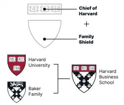Argent, on a saltire engrailed sable five escallops of the field and a chief of Harvard | Purported arms of the Baker family, for George Fisher Baker, who financed buildings and endowed a Professorship of Business Administration | ![]() |