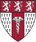 Ermine, a chief gules bearing three lions rampant argent and below a pale gules bearing a caduceus argent | Based on arms of Oliver family, for Henry Kemble Oliver, who endowed a Professorship and a Department of Hygiene, which became the Health Services | ![]() |