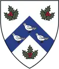 Argent, on a chevron azure between three sprigs of holly proper and fruited three wood-pigeons of the field, beaked and legged gules, and a chief of Harvard | Arms of Thomas Hollis, who gave Harvard its first endowed professorship, that of Divinity | ![]() |