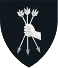 Sable, a hand dexter couped at the wrist and grasping three darts blunted with points down, one in pale, and two in saltire, all argent.[11] | Taken from the genuine arms of the Lowell family, as documented from at least 1563. |