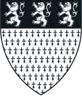 Gules, on a cross sable fimbriated argent, three mullets argent of five points in fess.[9] | Arms of the Kirkland family of Carlisle. |