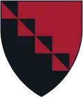 Per bend gules and sable; four squares per bend, each divided per bend and countercharged sable and gules.[13] | Preserved temporary arms from "North House", the Pforzheimers having given no arms. Colors represent Harvard and Radcliffe, and the squares the four buildings included. Colors violate heraldic rules. |