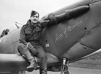 ![]() Hallowes with a Supermarine Spitfire fighter of No. 122 Squadron | |