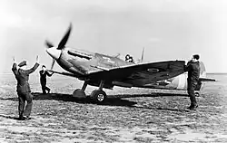 In June, Hallowes was promoted to acting squadron leader and appointed commander of No. 222 Squadron. At the time, the squadron, which used Spitfire Mk VBs, was based at North Weald. As with his previous squadron, Hallowes' command was involved in sweeps to France.[11] His tenure at the squadron was relatively short, for on 13 August he went to Ayr to take command of No. 165 Squadron.[2][12] His unit, which operated Spitfire VBs, then flew south to Eastchurch on 14 August in anticipation of its involvement in 'Operation Jubilee', the amphibious attack mounted on Dieppe.[13][14]