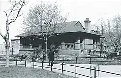 In June 1857, the Common Council of the City of Brooklyn voted to establish Tompkins Park, making it the first park established by the city of Brooklyn.[9] Funding was achieved six months later, as the incorporation papers were misplaced and had to be relocated.[10] In 1870, the Parks Commission took control of the park, and in 1871, James Stranahan commissioned Calvert Vaux and Frederick Law Olmsted – architects for Central and Prospect parks – to submit a plan for the park.[8][10] The land was originally named Tompkins Park, after former New York governor Daniel D. Tompkins.[7] The original design was highly symmetrical and did not include any trees or paths, believing they would be used "for clandestine purposes by people of bad character." In the 1870s and 1880s, the park was used for military review as well as public leisure; in 1875, the Tompkins Park Croquet Club was formed.[10][11] In 1878, a shelter and veranda meant for women and children was constructed.[12][10] In 1899, the Tompkins Park Library, located in the center of the park, opened under Public Library Association, and in 1901, it became a part of the Brooklyn Public Library system.[13][14] Artist William Merritt Chase, a resident of Bedford-Stuyvesant, was a frequent visitor of the park and painted it at least five times in the 1880s, creating some of the earliest color representations of the neighborhood.[15] The park also underwent improvements in the 1910s, with a concert space being constructed in 1915.[16][8] In 1916, the library and women's shelter were also renovated and combined.[17]