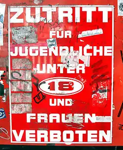 In the 1970s, police added barriers and signs advising youths and women against entering:[5][3][7][4] the former for reasons of protection against harmful influences, the latter because prostitutes would actively seek to chase away any women who entered, thus causing trouble. The signs are written in both English and German. Zutritt für Männer unter 18 und Frauen verboten in German[3] and Entry for men under 18 and women prohibited in English.[6]