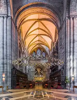 A new library building was constructed in the early 1990s and opened by Queen Elizabeth II in 1996.[10] In 1967 with the new liturgical fashion, George Gilbert Scott's iron choir screen was removed in pieces and discarded. It has since been restored and is now in the Victoria and Albert Museum.