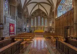 The choir stalls support forty 14th-century misericords. These misericords show a mixture of mythological beasts, grotesques and everyday events, there appears to be no pattern to the content.