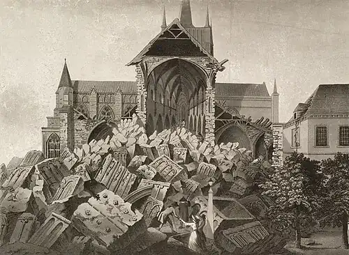 On Easter Monday, 1786, the greatest disaster in the history of the cathedral took place. The west tower fell, creating a ruin of the whole of the west front and at least one bay of the nave. The tower, which, unlike the west tower of Ely, was in the west bay of the nave, had a general resemblance to the central tower; both were profusely covered with ball-flower ornaments, and both terminated in leaden spires. James Wyatt was called in to repair the damage. As he did at Durham, instead of just repairing, he made alterations which were (and are) not universally popular.