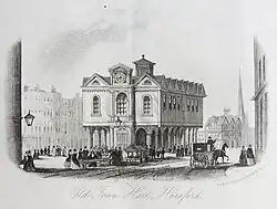 The original town hall, also known as the Market Hall, was an ornate timber building in the Tudor style which had been completed in 1620.[2][3][4] It was described by Nikolaus Pevsner as "a sight to thrill any visitor from England or abroad. It was the most fantastic black and white building imaginable, three-storeyed, with gables and the richest, most curious decoration."[5] In 1792, the top floor and tower were removed due to concerns about the strength of the timber supporting columns, and the remaining structure was re-roofed and covered with plaster.[6]