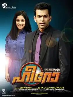 Hero is a 2012 Indian Malayalam-language action thriller film directed by Diphan, written by Vinod Guruvayur, and produced by Seven Arts International.[2] It stars Prithviraj Sukumaran, Srikanth, Yami Gautam (in her only Malayalam debut), Anoop Menon, Bala, Thalaivasal Vijay, Nedumudi Venu, Nandhu and Anil Murali.[3][4] The music was composed by Gopi Sundar, while the cinematography and editing were handled by Bharani K. Dharan and Samjith Mohammed.[5][6][7] In their previous collaborations in Kana Kandaen (2005) and Police Police (2010), Srikanth played the protagonist, while Prithviraj Sukumaran played the antagonist. In this film it is currently the opposite, Prithviraj plays the protagonist and Srikanth plays the antagonist.