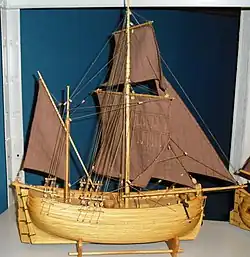 The ship had two or three masts. The mainmast and foremast (if present) could be lowered during fishing, leaving only the mizzen mast upright. It was square rigged on the main mast, with a gaff rig on the mizzen. It had a long bowsprit with jibboom and up to three headsails. The main course and topsail could be reefed.