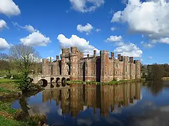 Herstmonceux Castle is a brick-built castle, dating from the 15th century, near Herstmonceux, East Sussex, England. It is one of the oldest significant brick buildings still standing in England.[1] The castle was renowned for being one of the first buildings to use that material in England, and was built using bricks taken from the local clay, by builders from Flanders.[2] It dates from 1441.[3] Construction began under the then-owner, Sir Roger Fiennes, and was continued after his death in 1449 by his son, Lord Dacre.[3] The castle was gifted to Queen's University at Kingston, a Canadian university, in 1993 by Alfred and Isabel Bader.[4][5]