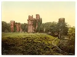 The profligacy of the 15th Baron Dacre, heir to the Fiennes family, forced him to sell in 1708 to George Naylor, a lawyer of Lincoln's Inn in London. Bethaia Naylor, who became the heiress of Herstmonceux on the death of her brother's only daughter, married Francis Hare and produced a son, Francis, who inherited in turn, his mother's property. The castle eventually came into the possession of Robert Hare-Naylor, who, upon the insistence of his second wife, Henrietta Henckell, followed the architect Samuel Wyatt's advice to reduce the Castle to a picturesque ruin by demolishing the interior.[10] Thomas Lennard, 17th Baron Dacre, was sufficiently exercised as to commission James Lambert of Lewes to record the building in 1776.[11][12] The castle was dismantled in 1777 leaving the exterior walls standing and remained a ruin until the early 20th century.[13]