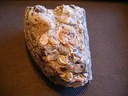 Hertfordshire puddingstone is a conglomerate sedimentary rock composed of rounded flint pebbles cemented together by a younger matrix of silica quartz. The distinctive rock is largely confined to the English counties of Buckinghamshire[1] and Hertfordshire but small amounts occur throughout the London Basin.[2] It is quite commonly found in fields in and around Chesham, where pieces can be seen as boundary stones and in rockeries. Despite a superficial similarity to concrete, it is an entirely natural silcrete. A fracture runs across both the pebbles and the sandy matrix as both have equal strength unlike concrete where the pebbles remain whole and a fracture occurs only in the matrix. Like other puddingstones, it derives its name from the manner in which the embedded flints resemble the plums in a pudding.[2][3] It forms the local base of the Upnor Formation of the Lambeth Group (lower Eocene, 56-55 million years ago).
