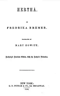 Hertha, fully New Sketches of Everyday Life: Hertha, or, A Soul's History: A Sketch from Real Life (Swedish: Nya Teckningar ur Hvardagslifvet: Hertha, eller En själs historia: Teckning ur det verkliga livet) is a Swedish novel by Fredrika Bremer, first published in 1856.
