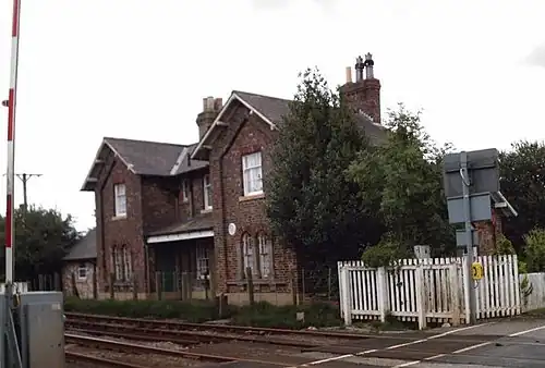 The signal box, located west of the crossing on the down side of the line, was bought into service in 1873, and unusually the gable end of the signal box was at a 90-degree angle to the running lines.[8]