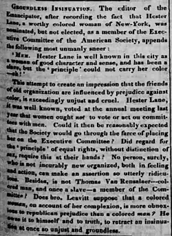 "Hester Lane – an outcry has been made about this individual, being rejected as a member of the Executive Committee of the National Society. . . . Reasons for objecting, because I had a conversation with Mrs. Lane a few days before on the woman question, and found her opposed to us, and strongly in favor of the new organizationists [AFASS]. With those facts before my mind . . . I rose and said the committee was full, although it was found afterwards that another person could have been constitutionally added, so that all the blame, if blame there is, ought to be attached to brother Ray, for nominating a person who he knew, or ought to have known, was opposed to us."[9]