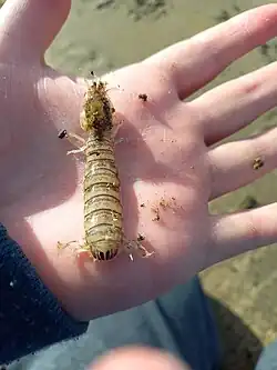 Heterosquilla tricarinata live in tidal mud flats creating extensive barrow systems.[5] This species of mantis shrimp is adapted for low dissolved oxygen levels in its benthic habitat.[6] The shrimp ranges from a light beige to greenish colour with the females often having a distinctive red stripe along the spine.