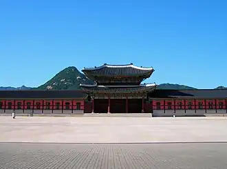 Heungnyemun is the second gate of the three gate system and entrance to the oejo (외조; 外朝; the outermost and most public-facing part of Joseon palaces[1]).[2] It was originally called Jeongmun (정문; 正門; Chŏngmun),[3] and was named Hongnyemun (홍례문; 弘禮門) in 1426.[4][5][6] After it was reconstructed, it received its current name.[7] The name change was to avoid using an identical Hanja character as was used in the birth name of the Chinese Qianlong Emperor.[8] It was demolished in July 1914 for the Chōsen Industrial Exhibition.[9][10] In its place was built the temporary Exhibition Building No. 1, which was completed by 1915.[11] In 1916, the Government-General of Chōsen Building began to be built in its place. After that building was demolished, Heungnyemun was reconstructed between September 11, 1997 to October 26, 2001.[12]