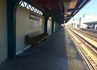 The Hewes Street station is a local station on the BMT Jamaica Line of the New York City Subway. Located at the intersection of Hewes Street and Broadway in Brooklyn, it is served by the J train at all times except weekdays in the peak direction and the M train at all times except late nights. The Z train skips this station when it operates.
