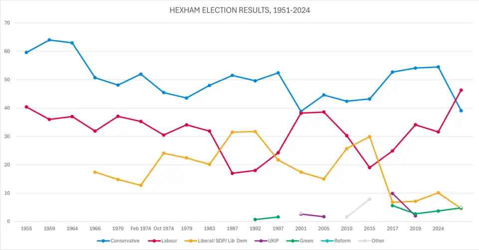 Hexham was considered a safe seat for the Conservative Party, having been under their control for almost a century, with generally safe majorities, from 1924 until it was gained by Labour in 2024. It was the only Conservative seat in the North East between the New Labour years in government from 1997–2010, and the only one in Northumberland from 1973 until the Conservatives gained Berwick-upon-Tweed from the Liberal Democrats in 2015. It was also the northernmost seat won by the Conservatives in 1997, in what would be their worst landslide defeat at any general election of the twentieth century; with all Conservative MPs in Scotland and Wales unseated that year.[7] In 1997, the Labour Party was very close to winning the seat, but the Conservatives retained it with a significantly reduced narrow majority of 222 votes.