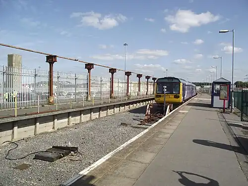 Passenger trains resumed in 1987, and in 1994, the layout was rationalised again as part of the programme of works associated with the building of the current Morecambe station. The last portion of double track on the branch from Holt Bank Junction to the former ICI sidings at Heysham Moss was singled, redundant trackwork was removed, and the old signal box dismantled (it was subsequently donated to the heritage Dean Forest Railway and has been restored and rebuilt at Lydney Junction).[5][6] After the work was completed, all that remained was the single line from Morecambe running into the one active platform and a private siding connection laid in the early 1970s into Heysham power station. Much of the land occupied by the old goods yard and disused platforms is used by the Port of Heysham's owners, Peel Ports as secure parking for HGVs waiting for ferries.