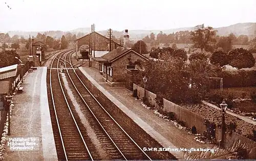 The station serving Heytesbury opened on 30 June 1856, on the Salisbury branch line of the Great Western Railway next to the bridge carrying the minor road to Tytherington. Originally just a single track, the line was doubled eastwards in 1899 and then westwards to Warminster the following year. The original platform became the one used by trains towards Salisbury and a second was added with a small waiting shelter when the line was doubled, but there was never a footbridge between the two platforms. A goods shed stood on the north side of the line, to the east of the passenger facilities.