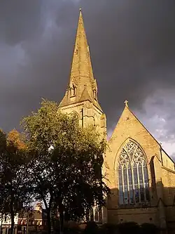 The parish church of St Luke the Evangelist is Heywood's major landmark – the focal point of the town centre. A place of worship at the site of St Luke's is known to have existed prior to 1611.[51] The church started life as a chantry chapel for the Heywood family. The Old Heywood Chapel was demolished in 1859 to make way for the present church, built to the designs of Joseph Clarke.[51] The foundation stone was laid on 31 May 1860, and the building was completed in 1862 using stone from Yorkshire and ashlar from Staffordshire and Bath.[51] St Luke's was consecrated on 8 October 1862 following a public subscription appeal, and dedicated to Luke the Evangelist. The tower and spire is detached from the main church building and stands 188 feet (57 m) high, dominating Heywood's centre and townscape.[51]