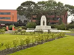 Heywood War Memorial lies in Memorial Gardens opposite the Parish Church of St Luke the Evangelist, and was originally erected "to the men of Heywood who gave their lives" during the First World War, but later, the Second World War.[52][53] It is a grey granite cenotaph decorated with wreaths and crosses. At the front is a bronze female figure holding a laurel wreath to symbolise peace. It was sculpted by Walter Marsden.[52][53] Heywood War Memorial was commissioned by the Heywood War Memorial Committee and unveiled on 22 August 1925 by Hewlett Johnson, the Dean of Manchester.[52] The roll of honour was not engraved on the memorial at the time of its unveiling owing to a lack of funds. Lobbying by the Heywood branch of the Royal British Legion secured a grant from Rochdale Metropolitan Borough Council to cover the £5,000 required; names from both world wars were engraved in 1986.[52]