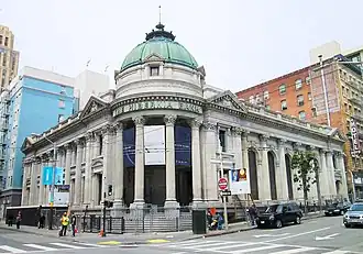 The Hibernia Bank,[2] headquartered in San Francisco, California, was founded in April 1859 as the Hibernia Savings and Loan Society.[3] In 1892, the company built a Beaux-Arts headquarters at 1 Jones Street at the corner of McAllister and Market Streets, designed by Albert Pissis. Slightly damaged in the 1906 earthquake and fire, it re-opened again just five weeks after the calamity; Pissis designed an addition to the building in 1908.