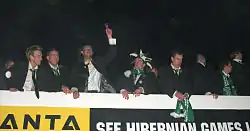 After mismanagement during the late 1980s, Hibs were on the brink of financial ruin in 1990.[36] Wallace Mercer, the chairman of Hearts, proposed a merger of the two clubs,[36] but the Hibs fans believed that the proposal was more like a hostile takeover.[37] They formed the Hands off Hibs group to campaign for the continued existence of the club.[37][38] This succeeded when a prominent local businessman, Kwik Fit owner Sir Tom Farmer, acquired a controlling interest in Hibs.[39] The fans were able to persuade Farmer to take control despite the fact that he had no great interest in football.[39] Farmer was persuaded in part by the fact that a relative of his had been involved in the rescue of Hibs from financial ruin in the early 1890s.[21] After the attempted takeover by Mercer, Hibs had a few good years in the early 1990s, winning the 1991 Scottish League Cup final and finishing in the top five in the league in 1993, 1994 and 1995. Soon after Alex McLeish was appointed as manager in 1998, Hibs were relegated to the First Division,[40] but immediately won promotion back to the SPL in 1999.[41]