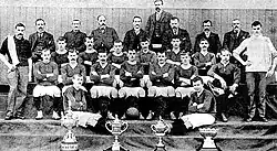 The club was founded in 1875 by Irishmen living in the Cowgate area of Edinburgh.[13] The name Hibernian (deriving from Hibernia, an ancient name for Ireland[5]), the colour green, the Celtic harp and the Irish language phrase Erin go bragh (meaning Ireland Forever) were adopted as symbols early on.[14] Founder Fr. Edward Joseph Hannan was the first president of the club and Michael Whelahan its first team captain.[15] James Connolly, the famous socialist and Irish Republican leader, was a Hibs fan,[16][17] while the club were "closely identified" with the Irish Home Rule movement during the 1880s.[10] There was some sectarian resistance initially to an Irish club participating in Scottish football,[13] but Hibs established themselves as a force in Scottish football in the 1880s.[5][10][16] Hibs were the first club from the east coast of Scotland to win a major trophy, the 1887 Scottish Cup. They went on to defeat Preston North End, who had reached the semi-finals of the 1887 FA Cup, in a friendly match described as the Association Football Championship of the World Decider.[18][19][20] Despite advertising the match as 'The Association Football Championship of the World', Preston had lost in the FA Cup semi-finals to West Bromwich Albion and were not the 'best' English side that year.