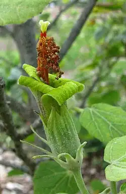 Hibiscadelphus distans is a shrub or small tree up to 5 m (16 ft) tall[3] with smooth bark and a rounded crown.[2] The heart-shaped leaves are 4–10 cm (1.6–3.9 in) in length and have rounded serrations on the margins and stellate trichomes (star-shaped hairs) on the upper on lower surfaces. The flowers are 3–4 cm (1.2–1.6 in) long and surrounded by triangular bracts. The sepals form a calyx tube around the greenish yellow petals, which turn maroon as they age. The fruit is a 2.5 cm (1 in) long, 1.5 cm (1 in) wide capsule that is divided into five sections. Each section contains two seeds around 5 mm (0.20 in) long. The capsule dehisces when mature, releasing the seeds.[3]