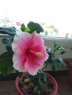 Hibiscus × rosa-sinensis, known colloquially as Chinese hibiscus,[3] China rose,[3][a] Hawaiian hibiscus,[3] rose mallow[4] and shoeblack plant,[5] is a cultigen of tropical hibiscus, a flowering plant in the Hibisceae tribe of the family Malvaceae. It is an artificial hybrid created in cultivation in pre-European times by Polynesians in the west Pacific from the species Hibiscus cooperi and H. kaute (native to Vanuatu and the French Polynesia, respectively). It is widely cultivated as an ornamental plant in the tropics and subtropics. The hibiscus is the national flower of Malaysia, where it holds official status, and is also considered the unofficial national flower of Haiti.