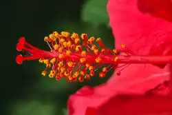 Each hibiscus flower has both male and female parts. The ovary and other female parts of the flower lie in the main structure of the hibiscus: the pistil, which is long and tubular. The five "hairy" spots at the top of the pistil make up the stigma, which is where pollen is collected. In the middle of the pistil is the style, which is the tube down which pollen travels to the ovary. The ovary lies at the bottom of the blossom, and each hibiscus has only one superior ovary. The male part of the flower, called the stamen, consists of stem-like filaments and anthers. Each filament ends with the pollen-producing anther.