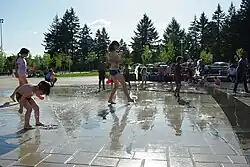 Plans for a dog park at the site were dropped in July 2006 when the city decided to build what became Hondo Dog Park at a different location.[11] Plans for 53rd Avenue Park were completed by December 2006, but construction did not begin as the city examined how to pay for the park's construction.[12] Funding for the first phase began to take shape in 2007 when the state gave Hillsboro a $500,000 grant from lottery funds for the initial construction.[13] This phase would cost $4 million and develop 10 acres (40,000 m2) at the 41-acre (170,000 m2) park with amenities including sports fields, two tennis courts, restrooms, parking, two basketball courts, lighting, and a courtyard that would include a fountain.[14] The Hillsboro Soccer Club also pledged $10,000 towards the project.[13] Construction began that year with the installation of an artificial turf covering to soccer fields.[15]