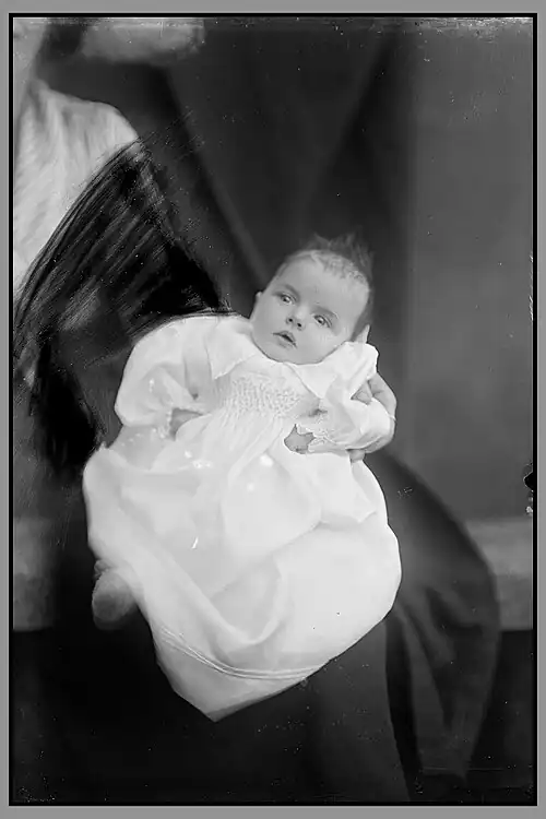 Having collected them for a decade, in 2013 Italian-Swedish artist Linda Fregni Nagler displayed 997 photographs in a series entitled The Hidden Mother at the Venetian Arsenal for the 55th Venice Biennale.[6] She also published them in the book The Hidden Mother (2013) with words by Geoffrey Batchen and the Biennale's curator, Massimiliano Gioni.[9] The images were produced between the 1840s and the 1920s using a variety of techniques. They include daguerreotypes, ambrotypes (which use the wet plate collodion process), tintypes and albumen prints.[6] The first picture that prompted the collection was a 5×4 centimetre tintype described on eBay as "funny baby with hidden mother".[10] Nagler's theory as to why the mothers are hidden, rather than simply appearing in the picture undisguised, is that "The mothers seem to have been aiming to create an intimate bond between the child and the viewer, rather than between themselves and the child."[11]