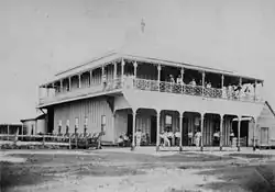 The earlier hotel, a substantial, 20 bedroom, two-storeyed timber building with double front verandahs and an observation tower, was erected in 1885 by Townsville contractors Hinton & Co., for publicans George Parker Hides and Duncan McColl, who also were in partnership in the Royal Hotel at Herberton. Their Cairns Hotel was located in Lake Street, adjacent to the site of the present Hides' Hotel, on land owned by Dr Edward Albert Koch, and let to Hides and McColl on a building lease. It was erected during the second wave of building activity in Cairns (the first being the 1876–77 establishment of the settlement), following Cairns's designation in 1885 as the destination of the Tablelands rail link to the interior goldfields, and its proclamation as a municipality (Borough of Cairns) in the same year. The hotel was renovated c. 1891, and by 1899 a substantial, two-storeyed timber wing had been constructed at the rear, and the accommodation had been extended to 32 bedrooms.[1]