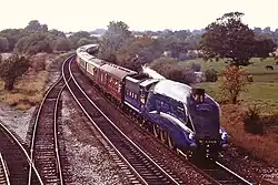 During the same period, British Rail also invested in a separate, parallel project to design a train based on conventional technology as a stopgap.[13] The InterCity 125, otherwise known as the High-Speed Train (HST), was launched in 1976 with a service speed of 125 mph (201 km/h) and provided the first high-speed rail services in Britain.[14] The HST was diesel-powered, and the Great Western Main Line (GWML) was the first to be modified for the new service.[15] Because the GWML had been built mostly straight, often with four tracks and with a distance of 1 mi (1.6 km) between distant signal and main signal, it allowed trains to run at 125 mph (201 km/h) with relatively moderate infrastructure investments, compared to other countries in Europe. The Intercity 125 had proven the economic case for high-speed rail,[16] and British Rail was keen to explore further advances.