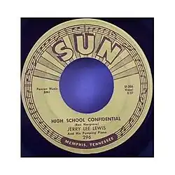 Jerry Lee Lewis recorded the song at the Sun Studio on February 14, then went to California, where the director set him, his bass player Jay W. Brown, his road drummer Russ Smith, and their instruments on the top of a flatbed truck and had Lewis lip-synch the song to a crowd of fake high school kids.[2] During this session Lewis recorded at least 14 takes of "High School Confidential" (no other songs were recorded), but at that time not a single take from this session was released. The takes from this session were officially released only in early 1980s: one take on Sun LP 1004 Wild One at the High School Hop (UK, 1982) and three takes on Charly Records 12-LP boxed set Jerry Lee Lewis: The Sun Years (UK, 1983). Lewis returned to this song on April 24, 1958, when he recorded three down tempo takes of it. The splice of two takes (3 and 1) from this session was released as the side A of the single Sun 296[3] in May 1958 (doubled by UK single by London Records HLS.8780 in January 1959), on EP Sun EPA 110 (UK RES.1187) and on the first self-titled album by Lewis, Sun LP-1230 (UK HAS.2138), all US releases in the same year 1958.[4][5] The film version was never released.