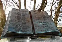 The High Water Mark of the Rebellion Monument[2] is a Gettysburg Battlefield memorial which identifies the Confederate Army of Northern Virginia units of the infantry attack on the Battle of Gettysburg, third day, with a large bronze tablet, as well as the Union Army of the Potomac's "respective troops who met or assisted to repulse Longstreet's Assault." The memorial is named for the line of dead and wounded of Pickett's Charge which marked the deepest penetration into the Union line at The Angle when "4,500 men threw down their arms and came in as prisoners".[3] The line is now generally marked with unit monuments which are also historic district contributing structures. The High Water Mark monument is accessible via Hancock Avenue which has parking spaces alongside, and a path leads to the site from a parking lot at the former Cyclorama Building at Gettysburg, which served for fifty years as a Gettysburg Battlefield visitor center by the National Park Service until it was demolished in 2013.[4]