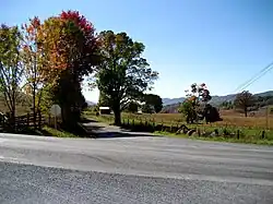 U.S. 220 is Highland County's major north–south route, entering Highland County from the north from Pendleton County, West Virginia. The road traverses 23.59 miles (37.96 km) within the county.[52] Approximately 3⁄4 mile (1.2 km) after entering the county, U.S. 220 crosses the South Branch Potomac River at Forks of Waters. Leaving Forks of Waters, U.S. 220 continues in a southwesterly direction on a roughly straight and level route passing the village of Possum Trot to the town of Monterey. Here, the route intersects U.S. Route 250.[11][55] South of Monterey, U.S. 220 passes by Trimble Knob, a conical shaped hill that was an active volcano or diatreme 35 million years ago.[56] Continuing south, U.S. 220 follows creek and river valleys in between mountain ridges and passes through the villages of Vanderpool and Mustoe. Approximately 15 miles (24 km) south of Monterey, U.S. 220 enters Bath County, Virginia near the village of Bolar.[11][55] Following U.S. 220 south through Bath County into Alleghany County, Virginia leads to a connection with Interstate 64 near Covington, Virginia.[50]