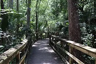 Elevated boardwalks meander through an old-growth bald cypress swamp with cabbage palmettos, ferns, bromeliads, orchids and other epiphytes. Some trees are believed to be over a thousand years old, and one is possibly the largest oak in Florida, with a girth of over 36 feet (11 m).