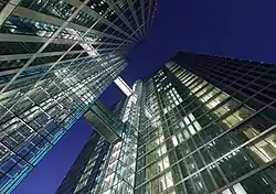 Highlight Towers is a twin tower office skyscraper complex completed in 2004 in Munich, Germany, planned by architects Murphy/Jahn of Chicago. Tower I is 126 m (413 ft) tall with 33 storeys, and Tower II is 113 m (371 ft) tall with 28 storeys, which make them among the highest buildings in the city. The towers are joined by two skyways made of glass and steel. Also in the complex are two low-rise buildings between the twin towers, that serve as a hotel and additional office space. Overall, the facility offers approximately 73,836 m2 (794,760 sq ft) of office space.