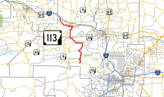 Highway 113 begins at Highway 10 south of Wye.[2] It runs north 5.8 miles (9.3 km) to Wye where Highway 300 forms a concurrency. The route then continues heading north for 3.2 miles (5.1 km) to Pleasant Valley where Highway 300 continues west. Highway 113 continues heading north and heads through Bigelow and then joins with Highway 60 west to Houston.[3]